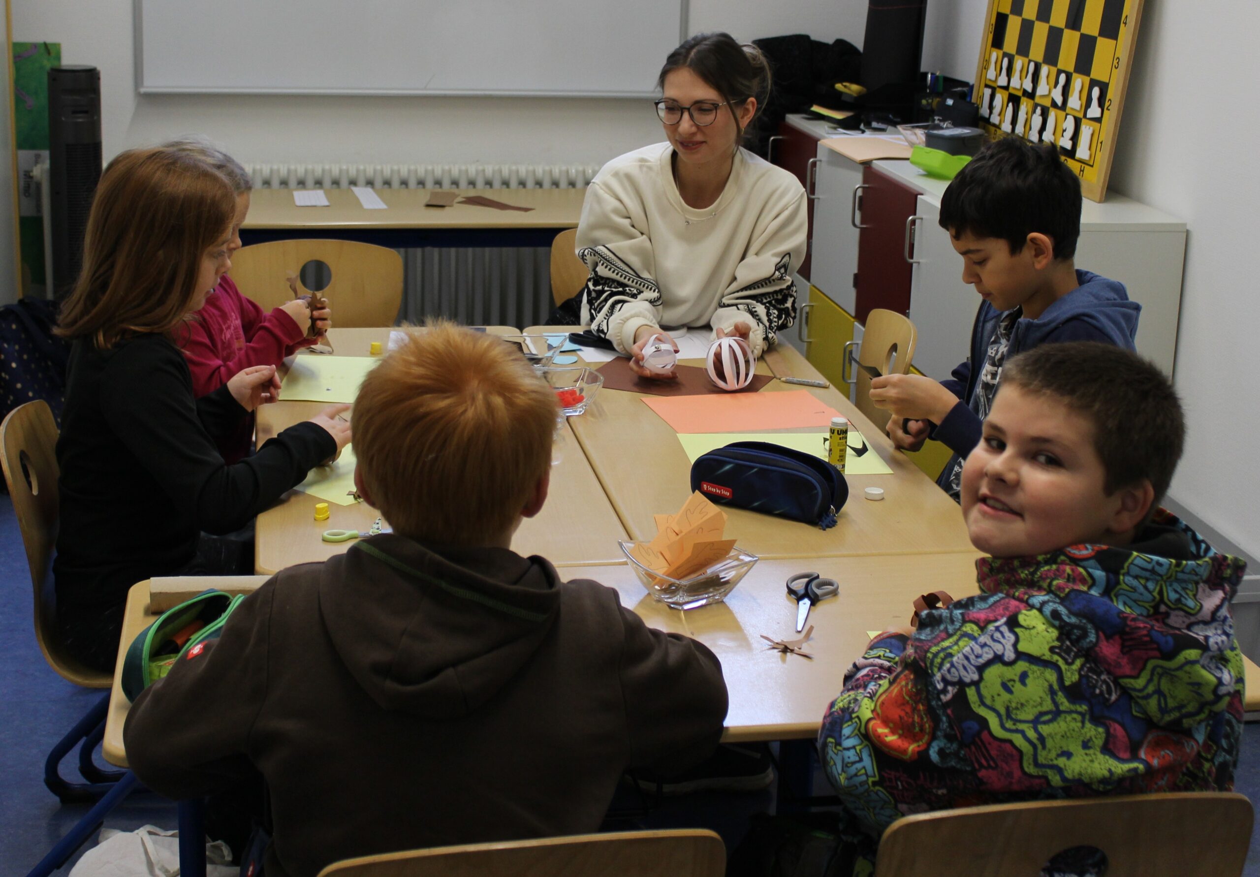 Heute lebt das ganze Schulhaus und überall sind Stationen zu finden, an denen man tolle Weihnachtsgeschenke basteln kann. In der Aula auf der Tischtennisplatte sind seit Tagen alle Stationen ausgestellt, damit sich die Kinder einen Überblick verschaffen können, was und wo sie basteln möchten.